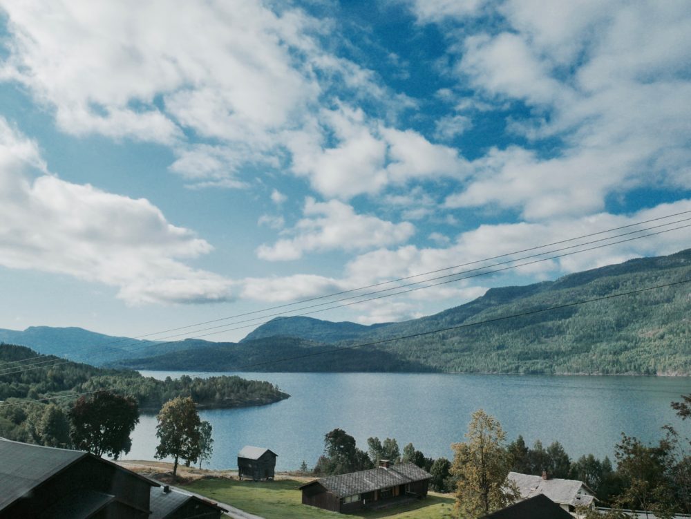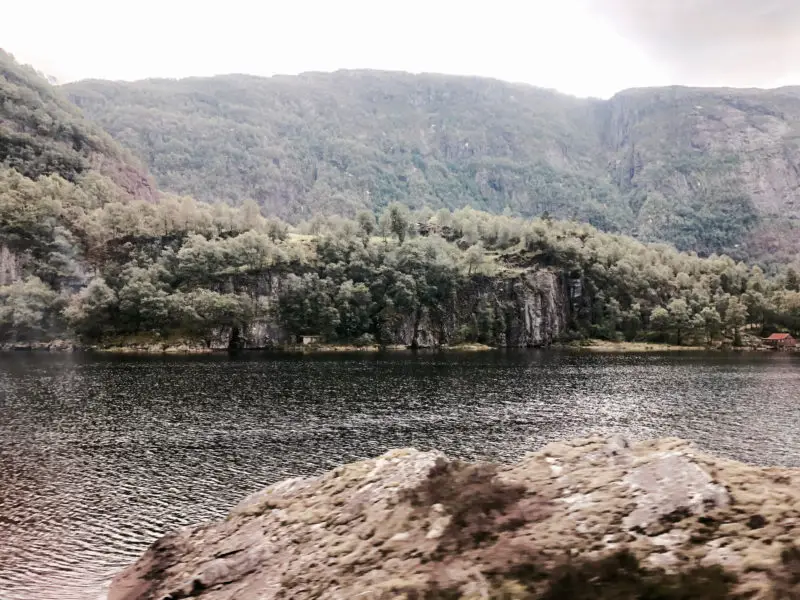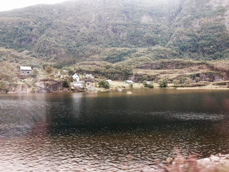 Jetzt habe ich auch etwas mehr Platz im Zug und kann mich so richtig schön ausbreiten. Nachdem wir die schon fast surreal wirkende Landschaft hinter uns gelassen haben, verlieren wir langsam wieder an Höhenmeter. Es wird immer grüner. Mehr Wiesen, mehr Seen und Flüsse. Kurz vor Bergen wird es dann nochmal richtig toll. Die Bergenbahn fährt an riesigen Felswänden vorbei. Alles wirkt so idyllisch und friedlich.
