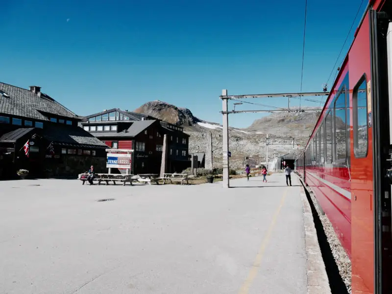 Nach 4 Stunden erreichen wir den Bahnhof Finse, den höchsten Punkt der Bahnstrecke. Falls ich nochmal in Norwegen bin, werde ich in Finse definitiv aussteigen. Die Landschaft hat mich wirklich total begeistert. Für mich geht es aber weiter. Schon eine halbe Stunde später erreichen wir Myrdal. Der Großteil der Fahrgäste steigt hier aus, um mit der Flambahn weiterzufahren.