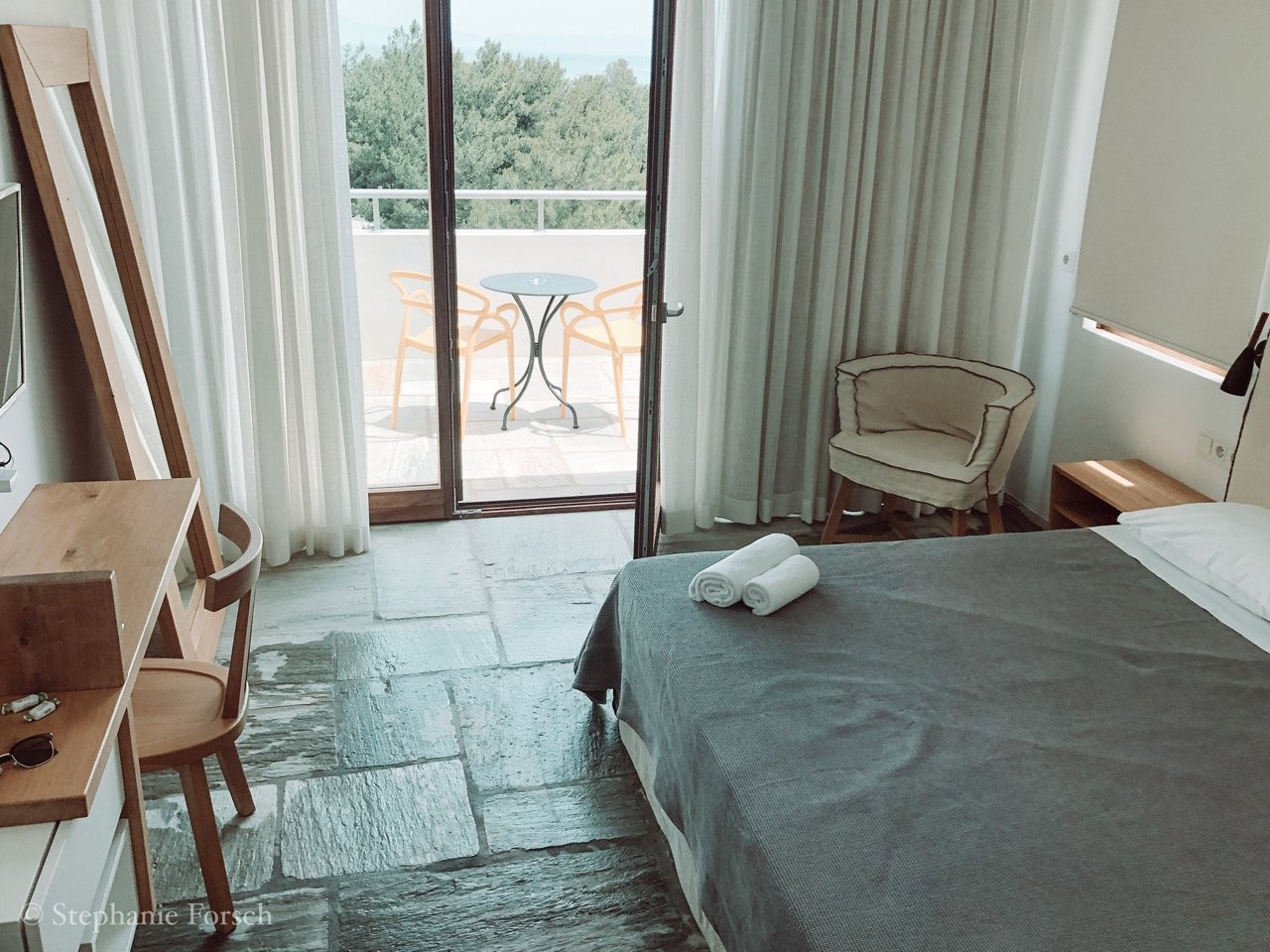 Schon während der Fahrt zum Hotel spüre ich, dass diese Insel genau das ist, was ich im Moment brauche. Links ragen hohe grüne Bergketten in den Himmel und rechts blicke ich auf türkisschimmerndes Wasser. Nach ungefähr 45 Minuten erreicht der Bus mein Zuhause für die kommenden 7 Nächte. Das Semeli Boutique Hotel liegt unweit der gemütlichen und charmanten kleinen Stadt Kokkari. Eingerahmt von Olivenbäumen und mit Blick auf das Meer sitze ich kurze Zeit später auf meinem Balkon und die Vorfreude auf die anderen Teilnehmer und das anstehende Yoga- und Wanderprogramm ist riesig.