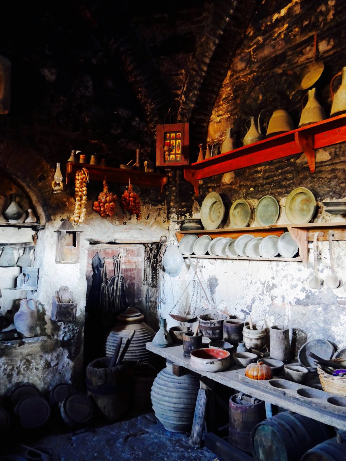 Vom Parkplatz aus sind noch einige Stufen zu erklimmen. Zur Mittagszeit mussten wir uns mit hundert anderen Touristen durch die schmalen Gänge nach oben drücken. Oben angekommen wird zuerst der Eintritt gezahlt (3 EUR). Anschließend verteilen sich die Menschenmassen eigentlich ganz gut. Das Klosterinnenleben wirkt sehr neu und frisch saniert. Zu bestaunen gibt es einen schönen Innenhof, die alte Küche, eine kleine schöne Kapelle und noch einige andere Räumlichkeiten. War auf jeden Fall sehr sehenswert.