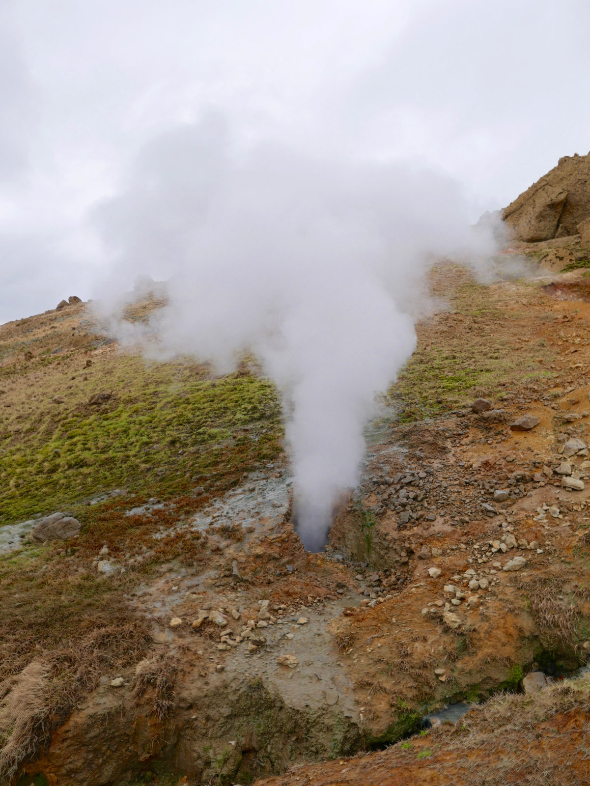 Und nach ungefähr einer Stunde sind wir an einer Stelle gelandet, an der es überall aus der Erde dampft. Das Wasser sprudelt aus heißen Quellen hervor und aus dem Felsen tönen laute Dampfgeräusche. Es ist der Wahnsinn!