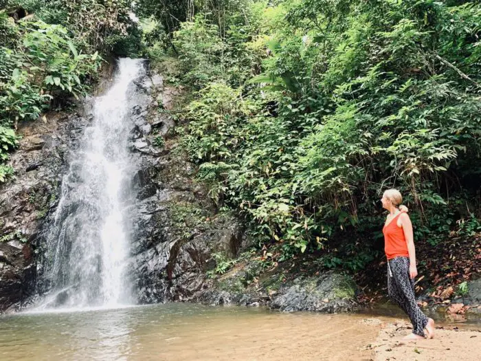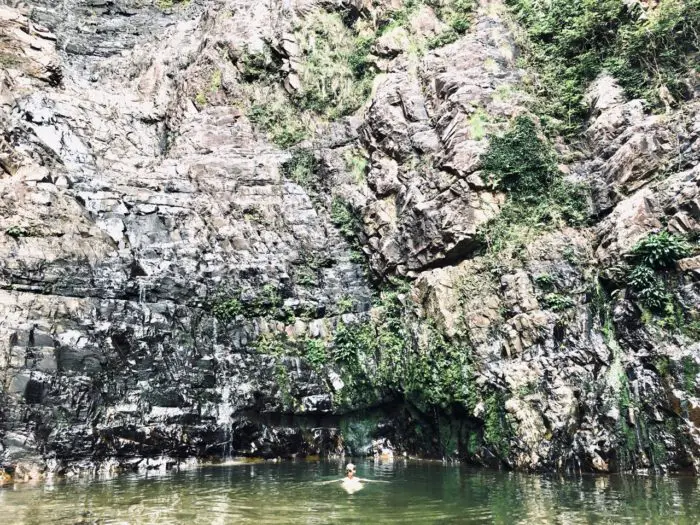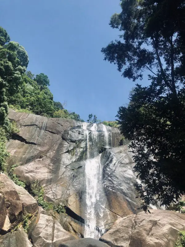 Oben angekommen kannst du dir eine kühle Erfrischung unter dem Wasserfall gönnen. Mit etwas Glück bist du fast allein dort. Als ich ankam, war lediglich noch eine kleine Gruppe Einheimischer vor Ort. Als Frau solltest du daran denken, außer deinem Bikini auch noch ein leichtes Shirt und vielleicht eine längere Hose (bspw. Leggings) zum Baden mitzunehmen.
