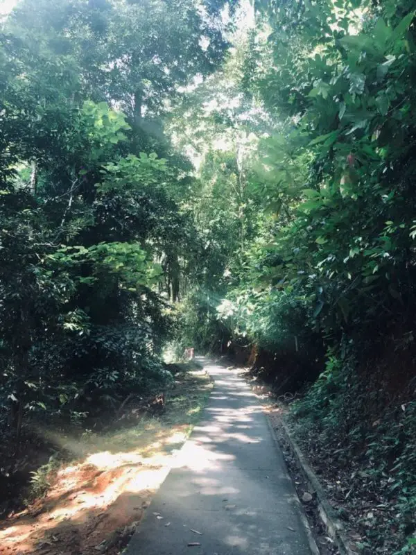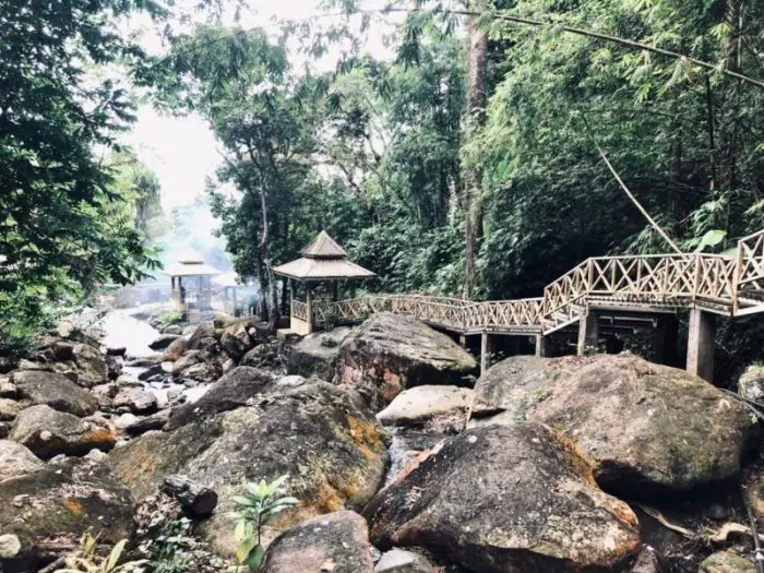 Ganz in der Nähe des Oriental Village (mit der SkyCab und der SkyBridge) befindet sich der Air Terjun Wasserfall. Es steht dort ein Parkplatz zur Verfügung, welchen du ab dem Oriental Village nach ca. 5 bis 10 Minuten Fahrzeit erreichen solltest. Danach führt ein ausgeschildeter Weg hinauf zum Wasserfall. Wie immer ist das bei der hohen Luftfeuchtigkeit eine durchaus schweißtreibende Angelegenheit. Unterwegs gibt es auch Toiletten.