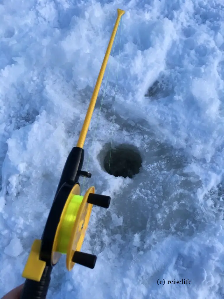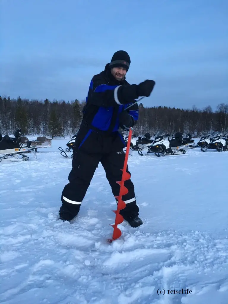 Ablauf: Mit dem Schneemobil-Schlitten geht es ca. 20 Minuten über den Inarisee und durch den Wald zu einer für das Eisangeln geeigneten Stelle. Der Guide demonstriert, wie wir mittels Eisbohrer ein geeignetes Loch zum Angeln in das Eis kriegen. Gar nicht so einfach, aber Chris hat den Dreh schnell raus. Danach erhält jeder eine kleine Angel und kann sein Glück probieren.