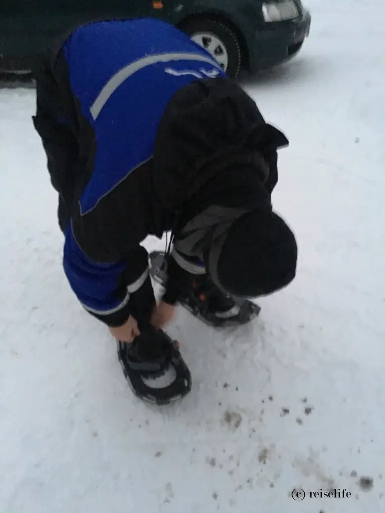 Ablauf: Ich weiß nicht wieso, aber beim Thema Schneeschuhwandern dachte ich an so alte Schneeschuhe aus Holz. Vor kurzem hatte ich auch noch einen Bericht gesehen, wo sich irgendein Wildnis Typ im Schnee mit seinen Schneeschuhen aus Holz abgerackert hat, ohne vorwärts zu kommen. Ich erwartete also irgendwie ein kräftezehrendes Unterfangen. Pustekuchen! Die Schneeschuhe sind sehr modern, sehr bequem und lassen sich einfach anziehen.