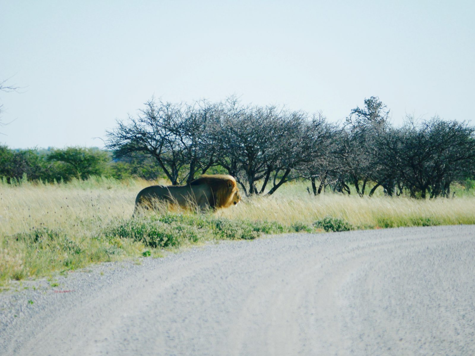 Wir fuhren weiter und hatten noch nicht einmal das erste Wasserloch (Twee Palms) erreicht, da sah ich rechterhand etwa 100 Meter entfernt etwas laufen. Ganz langsam, fast schon stolzierend. Ich nahm sofort mein Fernglas zur Hand – kann ich meinen Augen trauen? Ein LÖWE. Oh mein Gott, ich habe noch nie einen Löwen gesehen (außer im Zoo natürlich). Wir hielten sofort und beobachteten ihn eine Weile. Läuft der etwas direkt auf den Weg zu, auf dem wir gerade stehen? Tatsächlich – der Moment wenn ein Löwe direkt vor dir die Straße überquert – unbezahlbar!