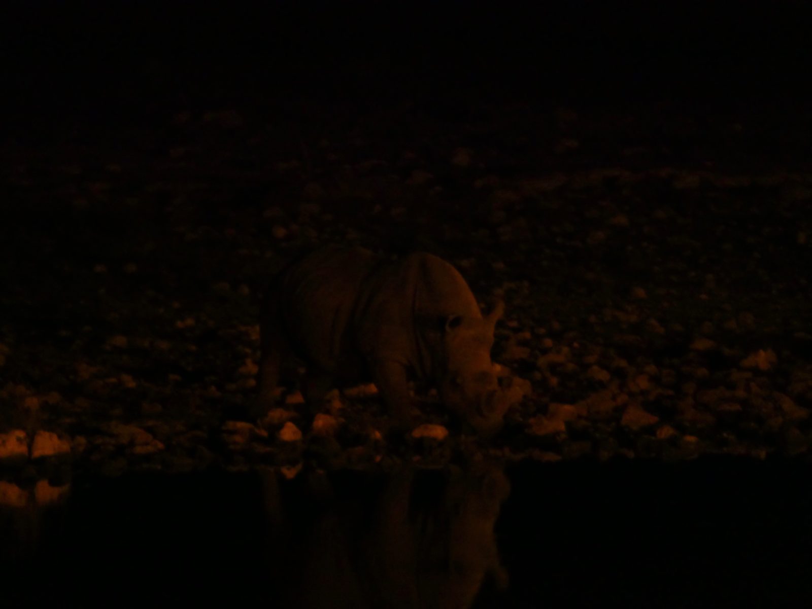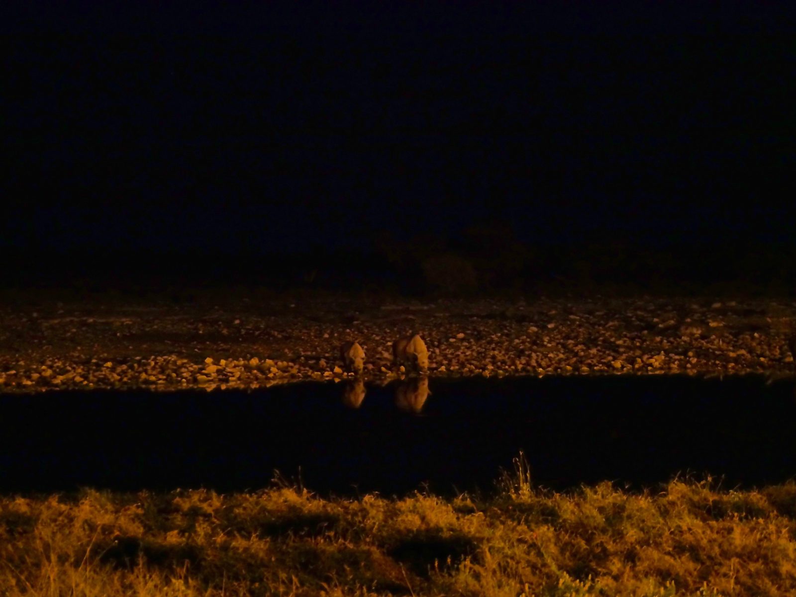 Da das Wasserloch vom Okaukuejo Camp praktisch direkt vor unserem Bungalow liegt, geht es gegen 20 Uhr auf eine Bank direkt vors Wasserloch. Wir haben leider jemanden dabei, der einen Hustenanfall nach dem anderen hat, aber keinen Grund sieht, das Wasserloch zu verlassen. Aber wir haben trotzdem Glück. Ganz langsam und vorsichtig wagen sich ein paar Nashörner heran.
