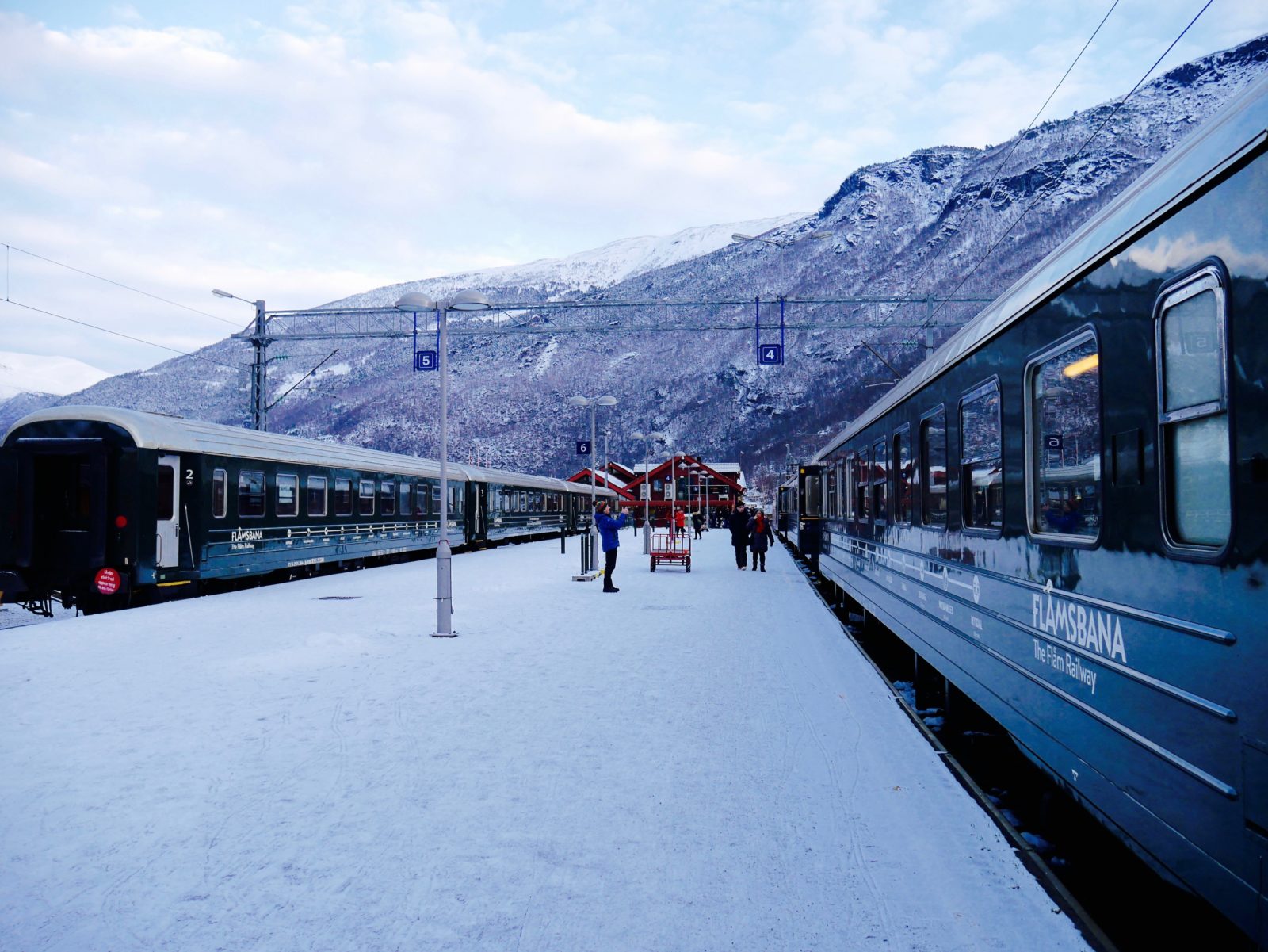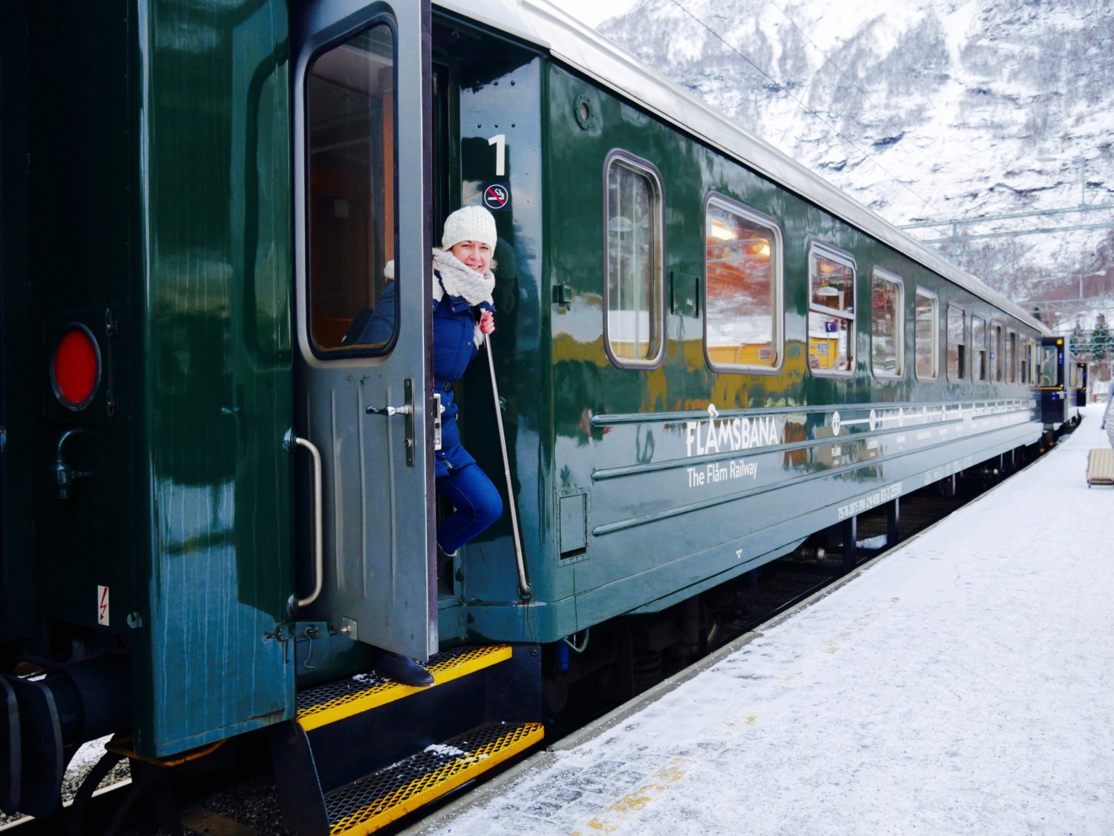 In Flam angekommen (14 Uhr) geht es gegen 14:40 Uhr weiter mit der Flambahn. Angeblich eine der spektakulärsten Zugstrecken der Welt. Jetzt im Winter läuft hier alles sehr gesittet ab. Ich weiß aber von anderen Erfahrungsberichten, dass es hier im Sommer echt voll werden kann und die Menschenmassen in den Zug stürmen. Insbesondere wenn Reiseanbieter oder Kreuzfahrttouristen mit eingebucht sind, kann es sehr eng werden.