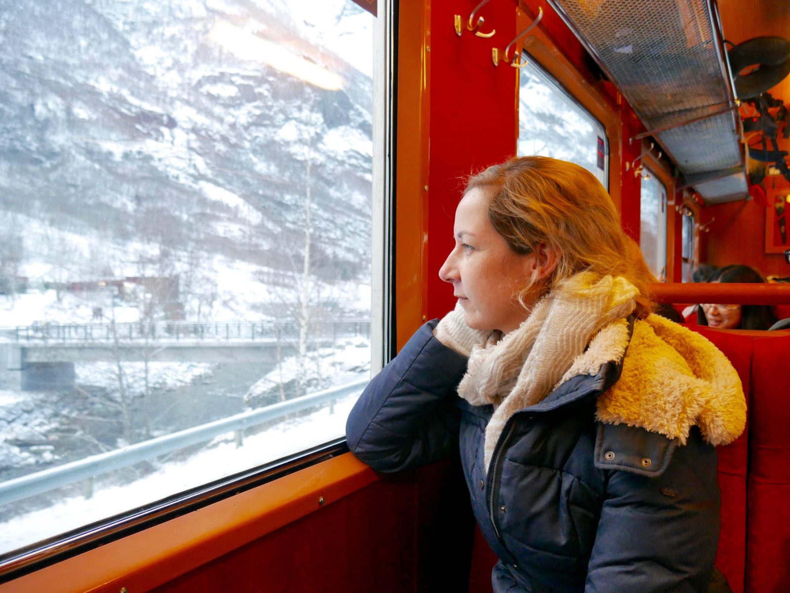 Die Bahn sieht auch innen sehr schön aus. Die Fahrt ist kurzweilig und dauert ungefähr 40 Minuten. Nach ungefähr 2/3 der Strecke gibt es linkerhand den Kjosfossen Wasserfall zu bestaunen. Die Flambahn hält hier für 5 Minuten. Jeder kann kurz aussteigen und Fotos machen. Im Winter ist dieser Wasserfall natürlich nicht ganz so gewaltig wie im Sommer.