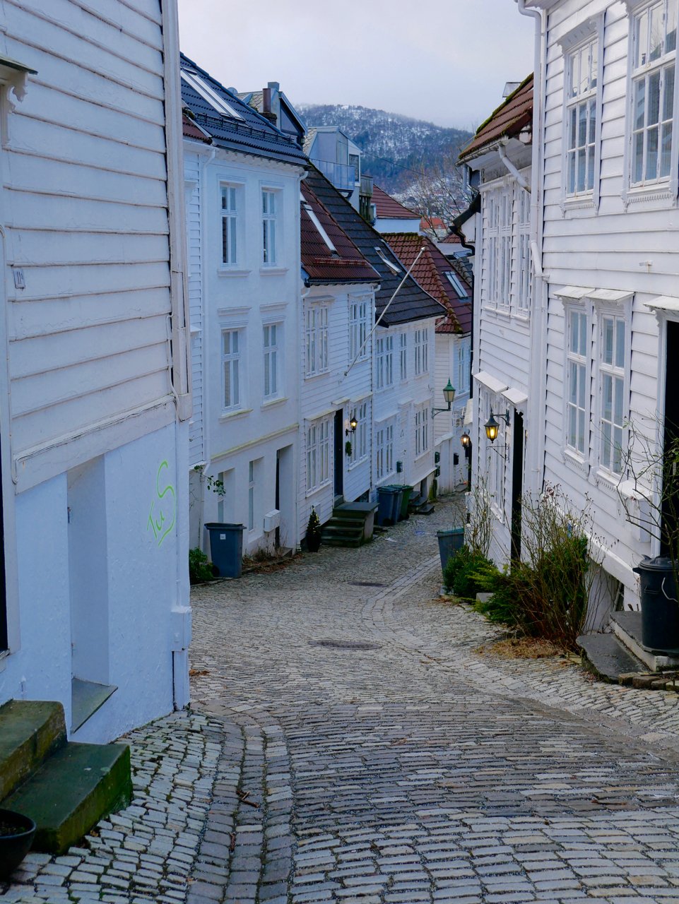 Am Wasser entlang geht es nun wieder ein Stück zurück Richtung Hafen und Fischmarkt. Biege dann am besten relativ zügig wieder links in eine Straße ein und laufe bergauf. Du landest dann nach ungefähr 10 Minuten Fußweg in einem alten Stadtteil von Bergen, der aus sehr vielen (5) wunderschönen weißen Holzhäusern besteht. Schlendere hier einfach ein wenig durch die romantischen Gassen. Einfach toll!