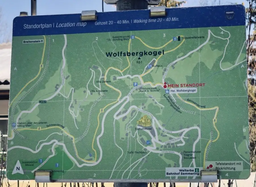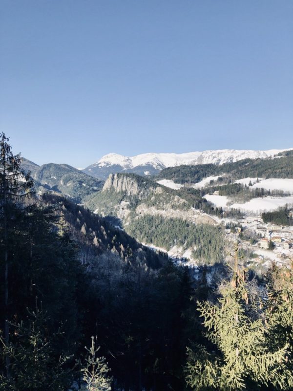 Du kannst nun entweder wieder zum Bahnhof Wolfsbergkogel zurücklaufen und mit der Bahn weiter fahren bis nach Mürzzuschlag, oder du machst es so wie ich – Ich bin bis zur nächsten Bahnstation Semmering vorgelaufen und erst dann wieder in den Zug eingestiegen. Ein schöner Wanderweg durch den Wald mit einer tollen Sicht!