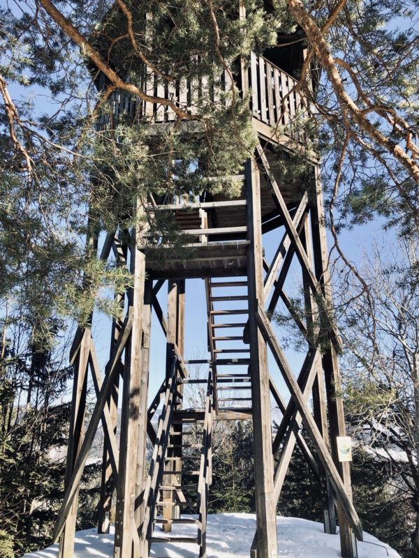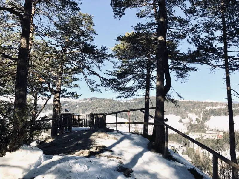 Direkt vor dem Bahnhof Wolfsbergkogel befindet sich eine Übersichtskarte zur Orientierung. Darauf sind die beiden Aussichtspunkte auch eingezeichnet. Wenn du vor dem Schild stehst, gehst du den Weg, der links davon liegt (Schulweg). Es geht etwas steiler bergauf – Aber nur kurz, versprochen. Schon nach kurzer Zeit zweigt der Weg nach rechts ab. Halte dich immer in Richtung Doppelreiterwarte. Es ist insgesamt ein sehr schöner Spaziergang von maximal 30 Minuten. Im Winter bei Schneefall solltest du unbedingt sehr festes Schuhwerk anziehen, mit dem du eine gute Trittsicherheit hast, denn es kann ab und zu rutschig werden.