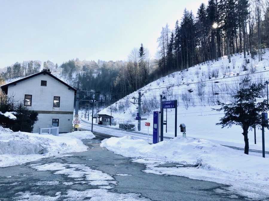 Mit dem Regionalzug (R 2317) kannst du bis Payerbach-Reichenau durchfahren (Fahrtzeit circa 1,5 Stunden). Die Fahrt bis dort hin ist eher unspektakulär. Wilde Bergketten gibt es bis da hin noch nicht zu sehen, aber sie lassen sich bereits in der Ferne erahnen. Bis zur Haltestelle Wiener Neustadt ist der Zug noch relativ voll, da auch viele Pendler diese Bahn nutzen. Danach lichtet sich der Zug schlagartig und ich bin in meinem Zugabteil fast ganz allein. 10:08 Uhr komme ich am Bahnhof in Payerbach-Reichenau an.