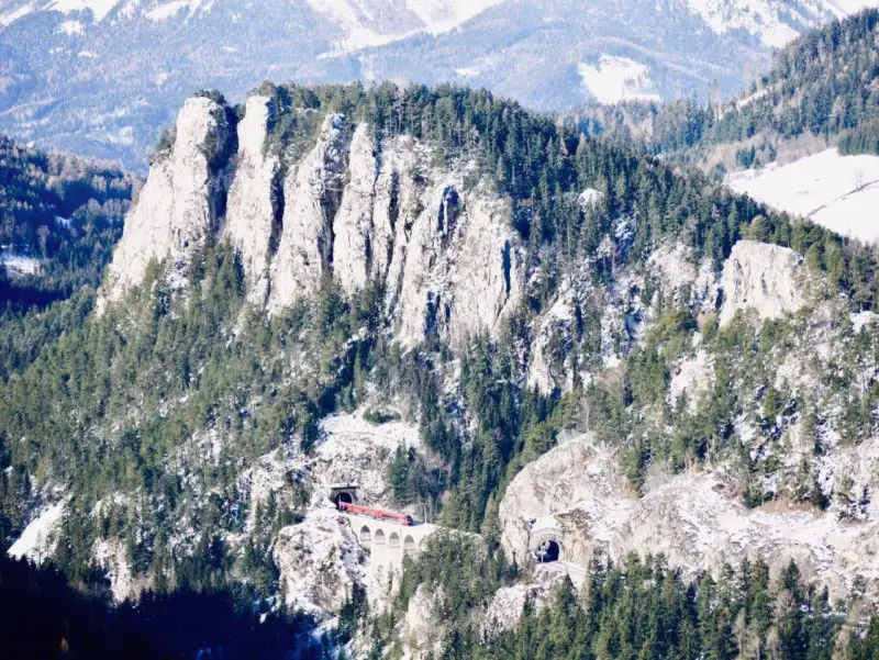 Die Semmeringbahn – Sie ist die erste Gebirgsbahn der Welt und verläuft von Gloggnitz bis Mürzzuschlag. Seit 1998 gehört sie zum UNESCO Weltkulturerbe. Gloggnitz liegt ca. 90 Kilometer südlich von Wien und so lässt sich diese Zugfahrt auch perfekt als Tagesausflug ab Wien planen.