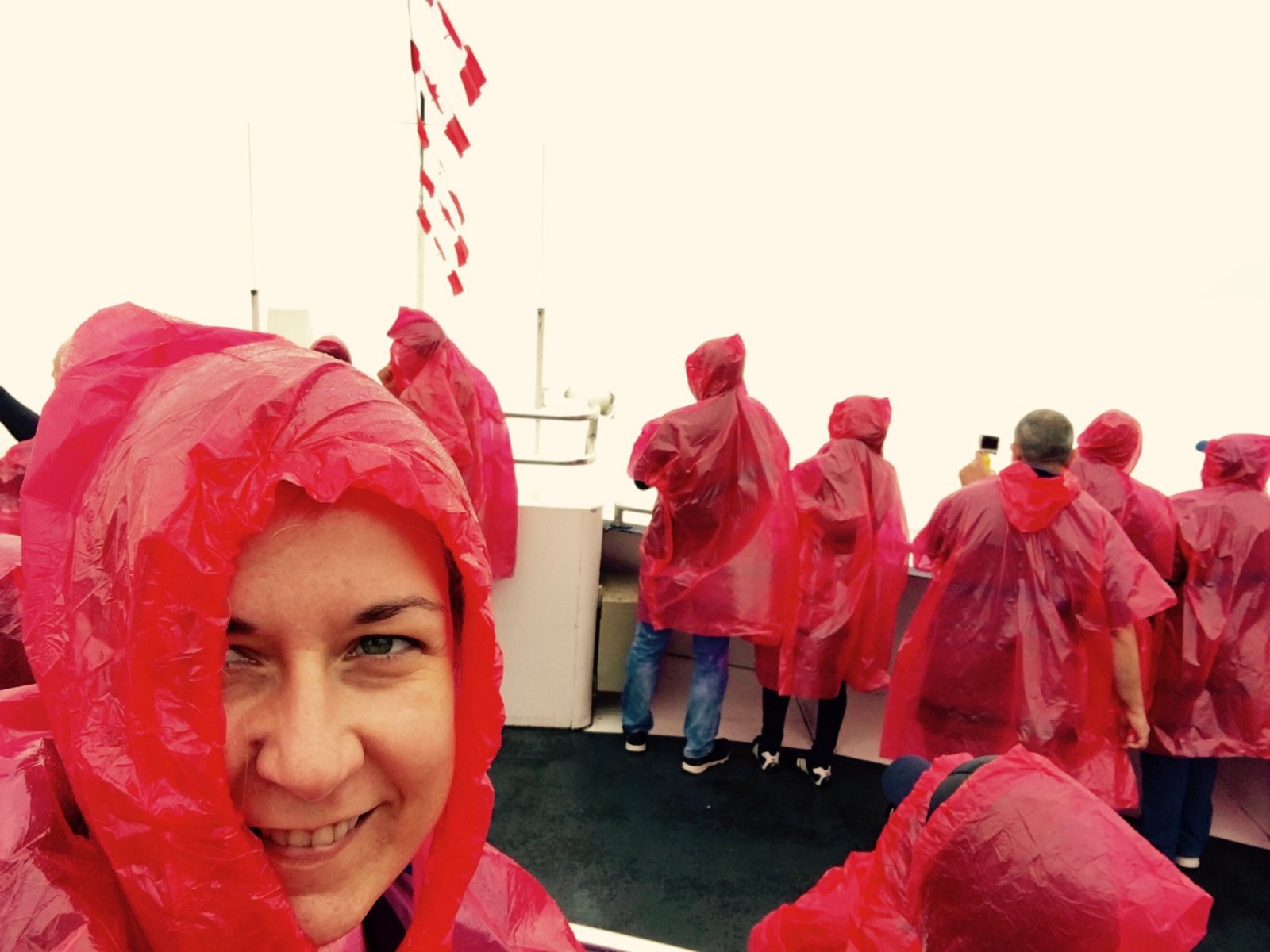 Es wird voller, immer voller. Ich gebe etwas Gas beim Laufen. Angekommen am Ticketschalter für die Bootsfahrt kaufe ich mir schnell ein Ticket (circa 25 CAD pro Person). Auch hier bin ich überraschend schnell an der Reihe und habe gerade einmal 10 Minuten gewartet. Was mich nun erwartet ist eine Bootsfahrt ganz nah an die Niagara Fälle heran. Ich bekomme ein Cape (muss nicht extra bezahlt werden). Die Cape Farbe auf der kanadischen Seite ist rot, auf der amerikanischen Seite blau. Somit sind die Boote immer sehr gut voneinander zu unterscheiden.