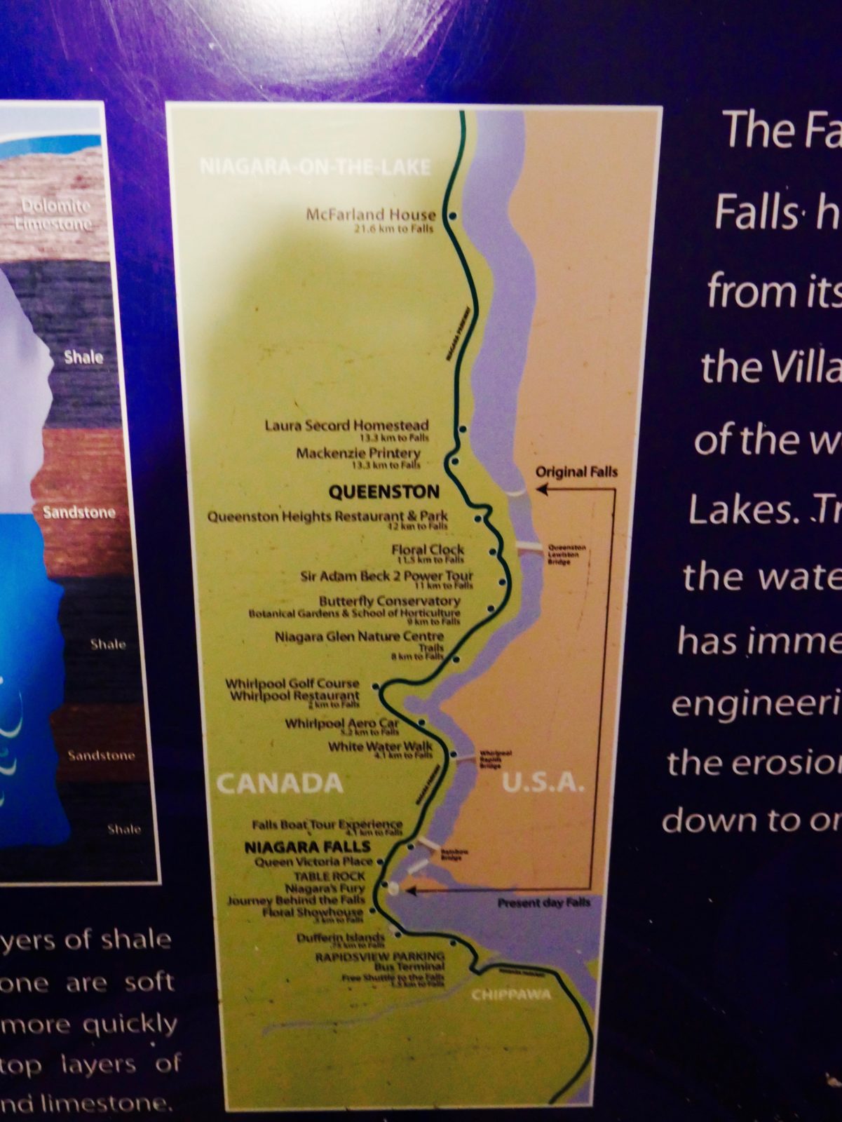 Von dieser Plattform könnt ihr ein paar tolle Fotos machen. Weiter führt im Inneren ein kleiner Weg quasi hinten den Fällen entlang. Ab und zu gibt es ein paar Gucklöcher direkt hinter die Fälle. Na ja, es gibt beeindruckenderes. Am Weg entlang gibt es rechts und links Informationstafeln zur Geschichte der Niagara Fälle.