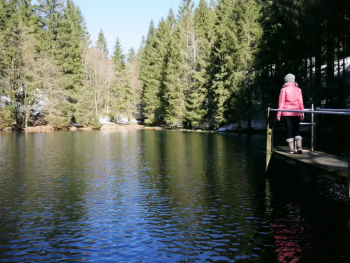 Wir setzen den Weg fort und folgen der Beschilderung nach Oberhof und Pfanntalsteich. An der asphaltierten Fahrtstraße angekommen, folgen wir dieser nach rechts für circa 300 Meter und biegen dann gleich wieder rechts in den Waldweg ein. Und nach nur ein paar Minuten Gehzeit ist er schon in Sichtweite: Der Pfanntalsteich. Fast schon schüchtern schmiegt sich dieser von Menschenhand geschaffene eiskalte Teich in den dichten Wald, und lädt wahrhaftig nicht zum Baden ein. Und während sich die Baumkronen der umliegenden Fichten im fast glasklaren Wasser spiegeln, wird es Zeit für eine nächste kleine Rast.