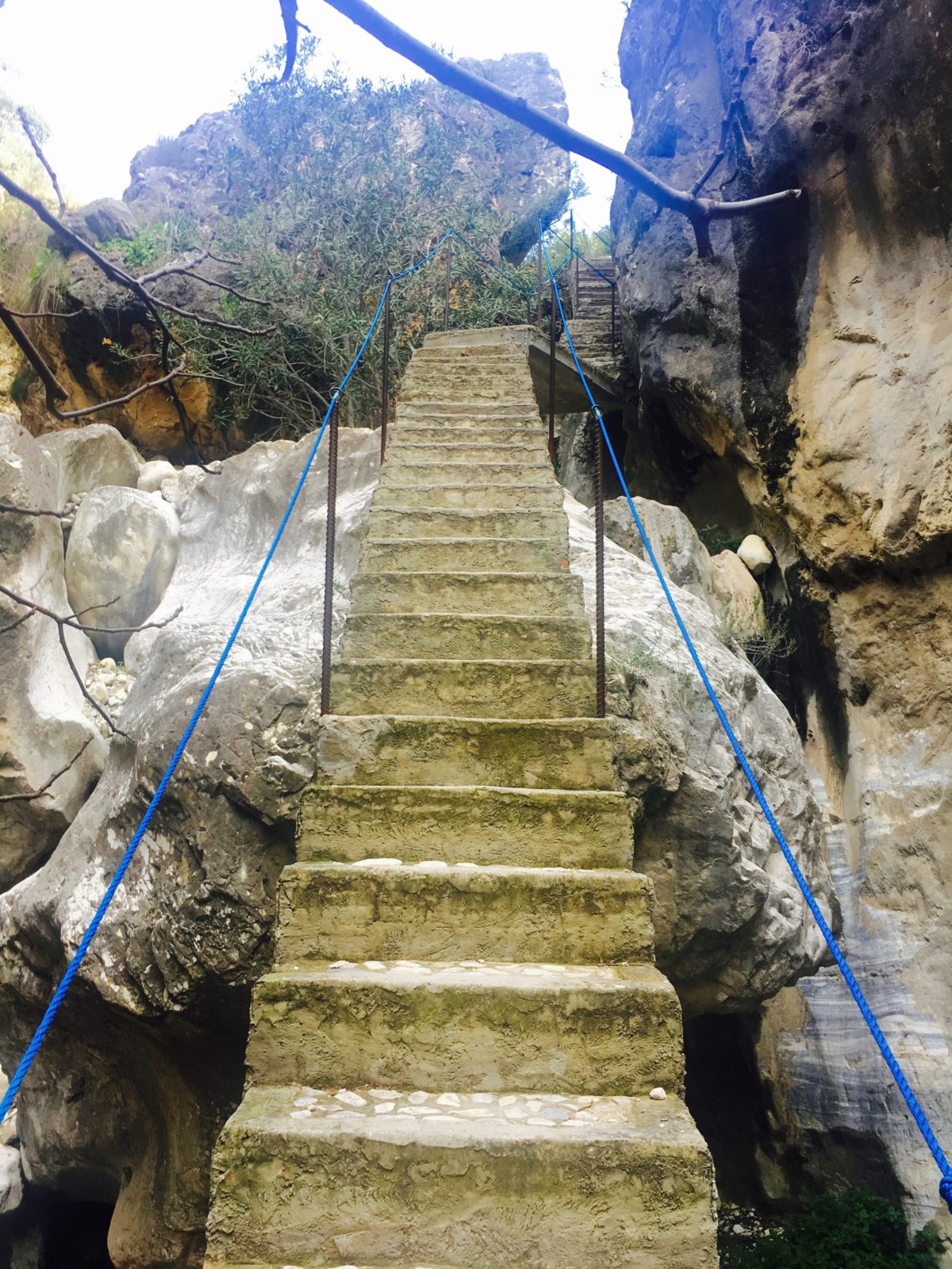 Zum Ende der Schlucht steht ihr vor einer Treppe. Diese geht ihr hinauf und kommt kurze Zeit später an einer Quelle vorbei, eine Art Steinbrunnen (Fuente el Caorro). Einen anderen älteren deutschen Touristen („Klaus“) höre ich immer nur zu seiner Frau sagen: „Da gehe ich nicht hoch, das kannst du vergessen“. Die Treppen gehen schon recht steil nach oben und im zweiten Teil gibt es links keine Befestigung. Schwindelfrei solltest du hier schon sein. Und auch Klaus hat es dann irgendwann geschafft. Es geht dann wie immer weiter im Flussbett. Und auf einmal ist es da, das Wasser. Es ist nicht hoch, aber schon so, dass nasse Füße vorprogrammiert sind.