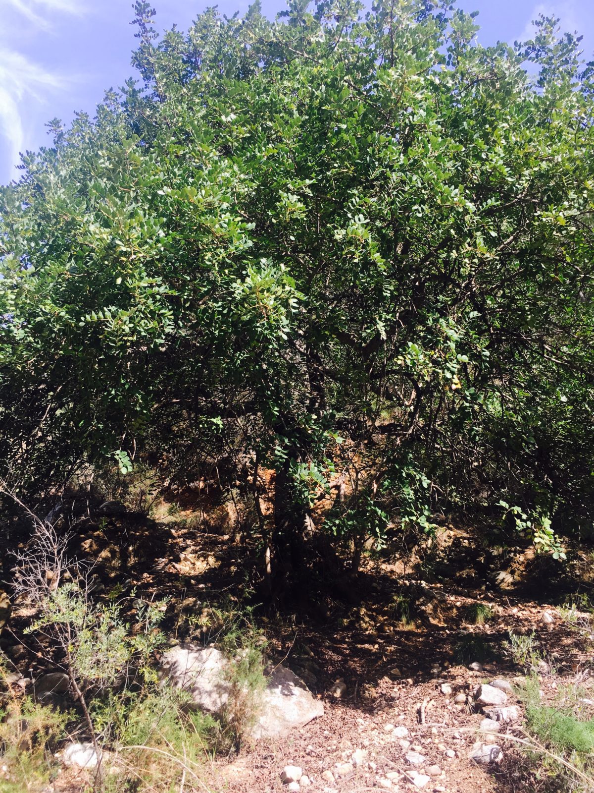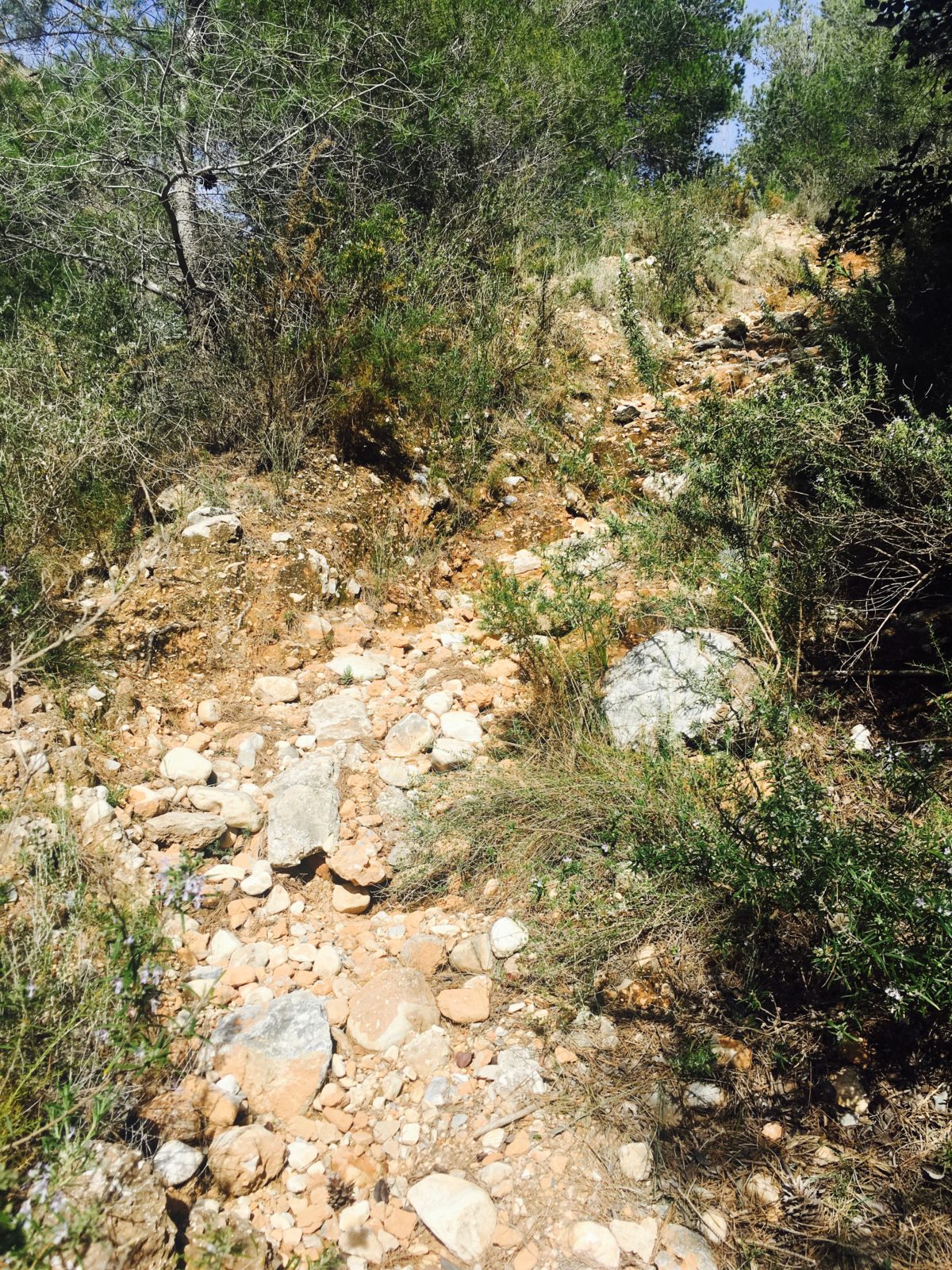Einfach kann jeder, also wählte ich noch einen kleinen Abstecher nach oben. Es gibt eine Stelle im Flussbett, da geht es rechts nach oben (kurz vor dem Sportplatz von Frigiliana, den ihr links oben sehen könnt). An dieser Stelle steht ein großer Johannesbrotbaum. Dort biegt ihr scharf rechts in einen Sandweg ein. Dieser führt steil nach oben. Definitiv ein Anstieg, bei dem ich schnell aus der Puste gekommen bin. Hier ist absolute Trittsicherheit notwendig. Zwischendurch knallt mir noch ein Ast an die Stirn. Dass ich eine dicke Schramme an der Stirn habe, werde ich erst zu Hause feststellen.