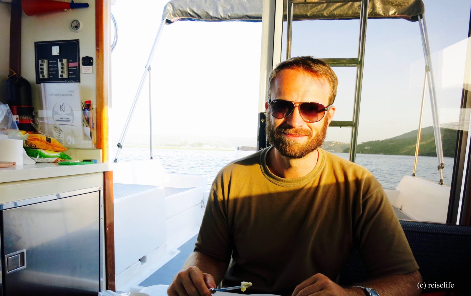 Wir sind froh, dass wir zu zweit auf dem Boot sind. Einer kann steuern, der andere hält unterstützend noch die Augen offen. Auch den Anker wieder hochzuholen, ist nicht ganz so einfach. Hier ist durchaus Manneskraft gefragt.